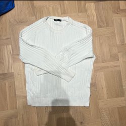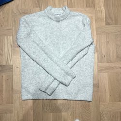 Grå stickad tröja med rund hals och långa ärmar. Storlek L, fint skick.