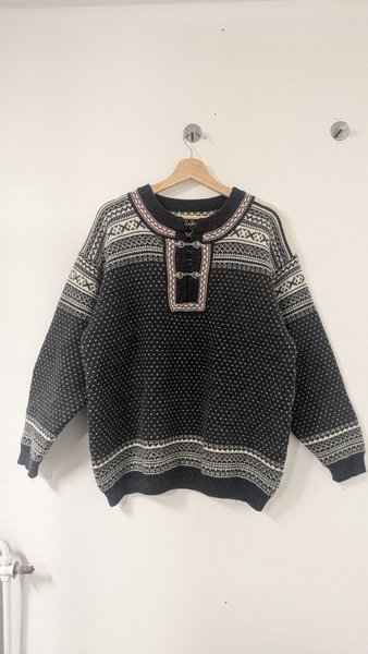 Stickad tröja med ett traditionellt mönster i svart och vitt. Tröjan har en rund halsringning med dekorativa detaljer och en unik knäppning framtill.