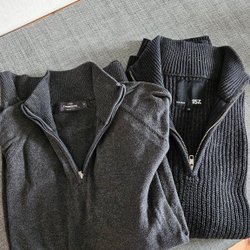 Två tröjor med lång ärm. Den ena är mörkblå med ett rombmönster storlek XL, och den andra är mörkgrå med flätstickat mönster storlek L.