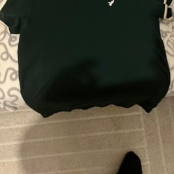 Mörkblå tröja med dragkedja vid halsen och en liten guldfärgad fågel broderad på bröstet.