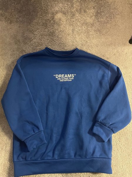 En blå sweatshirt med texten "DREAMS ARE CLOSER THAN THEY APPEAR" tryckt i vitt på framsidan.