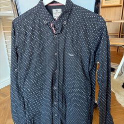 Svart skjorta med ett diskret mönster av små vita prickar. Skjortan har långa ärmar och knappar framtill. Kragens omkrets 44 cm
