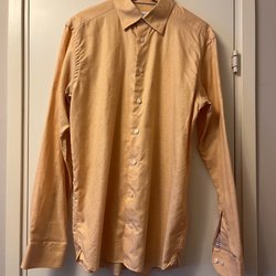 Gul skjorta med långa ärmar och krage. Skjortan har knappar framtill.