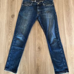 Klassisk mörkblå kavaj med två knappar fram och tre knappar vid ärmslut från svenska märket Widengrens. Kavajen har fickor på framsidan och innerfickor. Det står inte någon exakt storlek men skulle gissa på att det är storlek 50-52 efter som den är lite för stor för mig som har storlek 48.