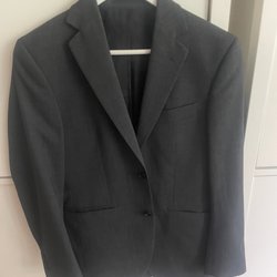 Grå kavaj med två knappar fram och en bröstficka. Fickor på båda sidor.