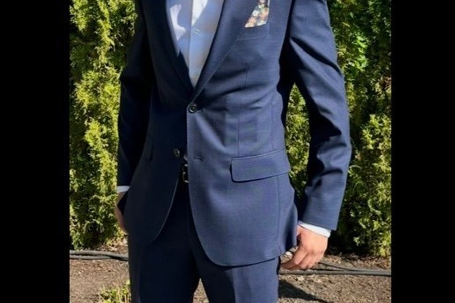En mörkblå kostym bestående av en kavaj och matchande byxor. Skjorta följer med i strl S. Endast använd ett par gånger innan den blev för liten. Näsduk ingår ej. Nypris för alla delar totalt 4.000kr