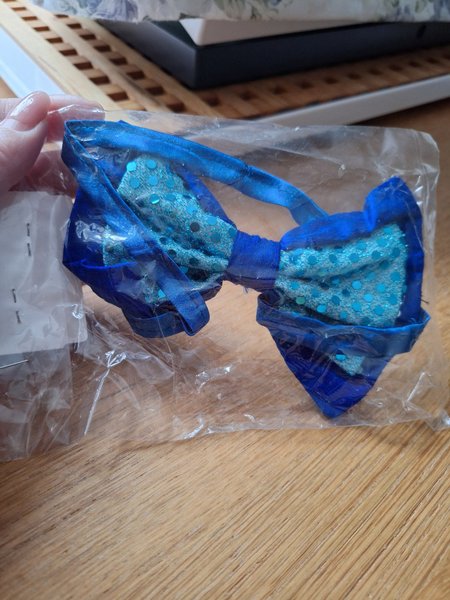 Blå fluga med paljetter, förpackad i plast. Flugan har en justerbar rem för att passa olika halsstorlekar. Paljetterna är i en ljusare blå nyans och ger flugan en glittrig effekt.