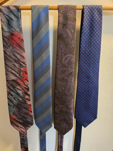 Detta är en samling av fyra slipsar med olika mönster. En slips har ett abstrakt mönster med inslag av rött, blått och grått. En annan har diagonala ränder i blått och grått. Den tredje slipsen har ett paisley-mönster i bruna och lila toner, och den sista slipsen har ett geometriskt mönster i lila och grönt.