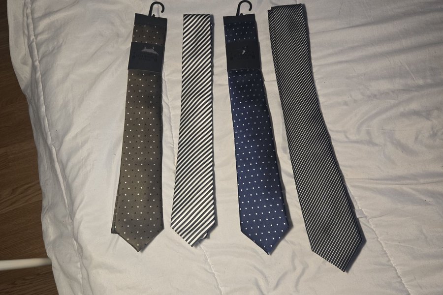 Här är ett set med fyra slipsar i olika mönster. En är brun med vita prickar, en är svart och vit randig, en är mörkblå med vita prickar och den sista är svart och vit randig.
