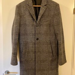 Elegant gråmelerad kappa med ett klassiskt rutmönster. Kappan har en stilren design med knäppning fram och praktiska fickor.