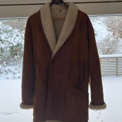 Brun jacka med krage i fuskpäls och dubbelknäppning,modellen på bilden är small.