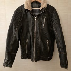 Svart läderjacka med en brun fuskpäls krage. Jackan har en dragkedja framtill och två stora fickor med lock och tryckknappar. Insidan är fodrad med ett mjukt, brunt material som liknar fuskpäls. Ärmsluten har en justerbar rem med tryckknapp. Jackan har en avslappnad passform.