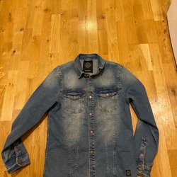 Klassisk jeansjacka med krage och knäppning framtill. Jackan har två bröstfickor med knappar.
