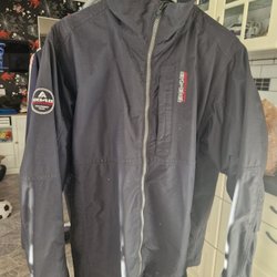 Svart jacka med dragkedja framtill och flera fickor med dragkedja. Jackan har vita detaljer på axlarna och ärmarna.