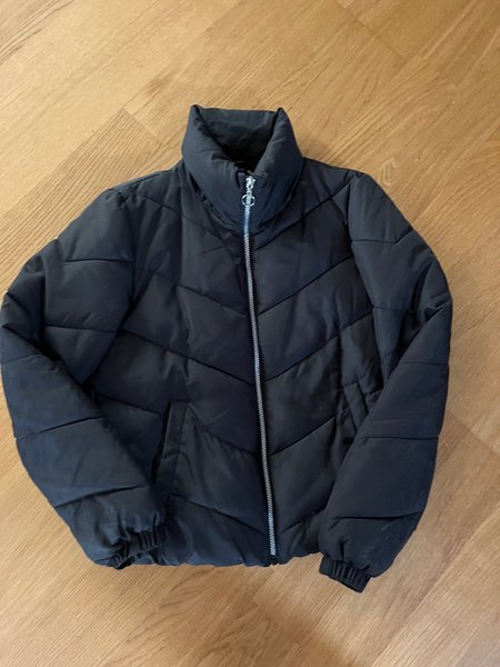 Svart pufferjacka med dragkedja framtill och hög krage. Jackan har en quiltad design med horisontella sömmar och resår i ärmsluten.