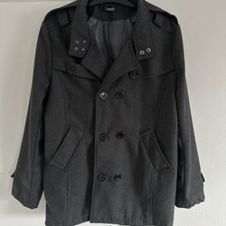 Svart jacka med dubbelknäppning och dekorativa detaljer på axlarna. Jackan har en klassisk krage och en stilren design.