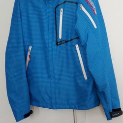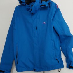 En marinblå jacka med dragkedja framtill. Jackan har en hög krage och två fickor med dragkedja i sidorna. Det finns en liten logotyp på bröstet.