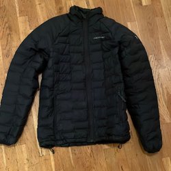 Svart jacka från Peak Performance. Jackan har en dragkedja framtill och en huva. Finns en liten reva i fickan och lite färg vid ena fickan, dragkedjan behöver fixas. Annars i fint skick