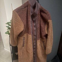 Beige jacka med bruna detaljer. Jackan har en dragkedja framtill och dekorativa detaljer på ärmarna och framsidan.