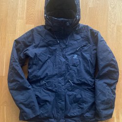 Marinblå jacka med dragkedja fram och två fickor med dragkedja. Jackans färg syns bäst på bild 3. Storlek M.