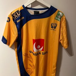 En gul långärmad sporttröja från Nike. Tröjan har en rund halsringning och en svart Nike-logga på bröstet.