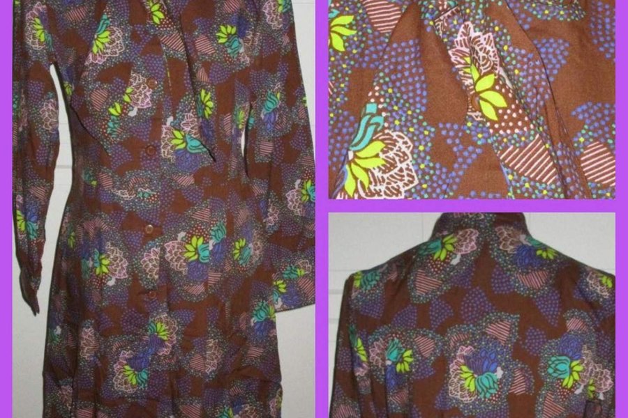 Fin klänning i brunt med lila, grönt,blått mönster. Knäppning halva vägen fram och knytband vid hals. Veck på kjoldelen. Knäppning i ärmslut. Bra skick. Storleksmärkt 40. 100% akryl, känns som mjuk fin bomull. Ingen stretch.