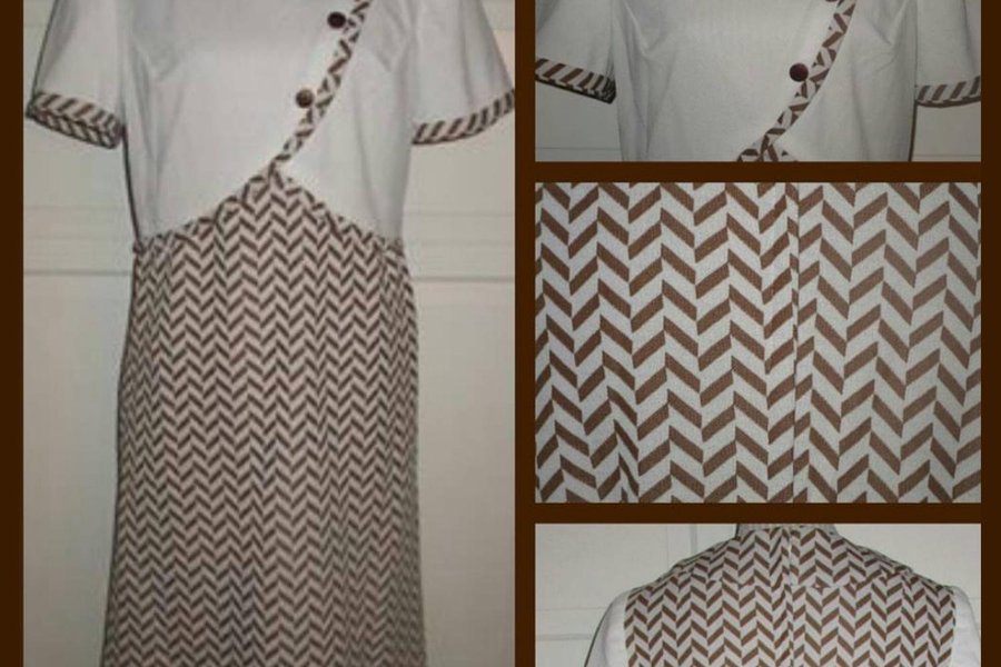 Mycket fin troligtvis hemsydd klänning i brunt och vitt. Metalldragkedja bak. Dekorativa knappar fram. Stretchig lite tjockare polyester.