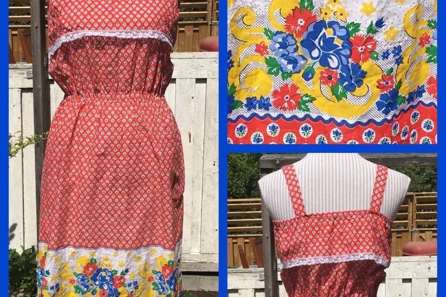 Fin sommarklänning i bomull. Liten spets vid byst och runtom. Resår uppe och i midja. Mycket bra skick.
