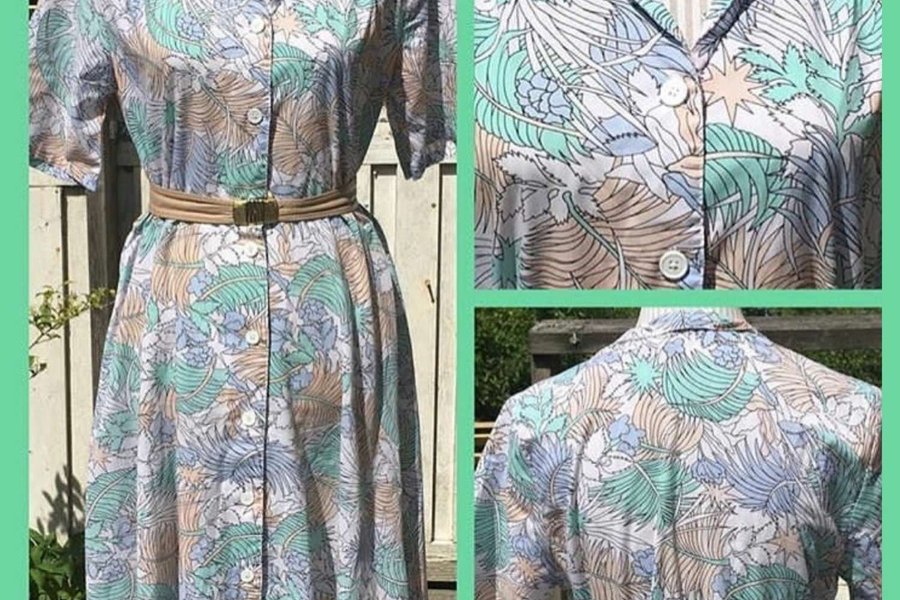 Fin sommarklänning i tunn bomull. Knäppning halva vägen fram. Storleksmärkt 40. Den andra lappen är bortklippt. Skärpet hör ej till. Den är omsydd i midjan så att midjesömmen har hamnat mer i midjan än långt ner. Bra skick. Knappen vid skärpet saknas då man antagligen har haft ett bredare skärp till och då har knappen hamnat i vägen.