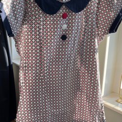 Fin klänning i bomull. Storleksmärkt 44. Knäppning fram och fickor. Matchande knytskärp. Bra skick men har en blekning fram nertill på höger sida. Se bild. Minimal skada i tyget vid fästet av den nedersta knappen.