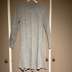 Grå, ribbstickad klänning med lång ärm och V-ringning. Klänningen har en figurnära passform och en slits baktill.