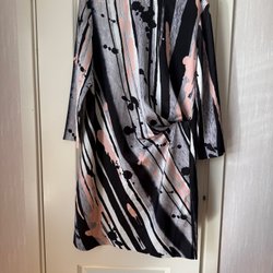 Mörkblå omlottklänning med ett unikt mönster. Klänningen har trekvartsärmar och knyts i sidan och knäpps innanför med en knapp.
