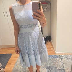 Orange klänning med korta ärmar och ett dekorativt band runt midjan. Använd 1 gång.
