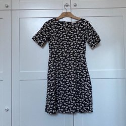 Långärmad klänning med ett unikt svart mönster på en beige bakgrund. Klänningen har en v-ringning och en avslappnad passform.