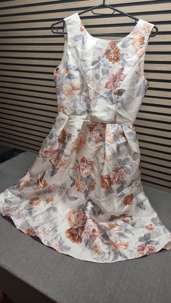 Kjole med blomsterprint. Kjolen har en tætsiddende overdel og et skørt, der går ud fra taljen.