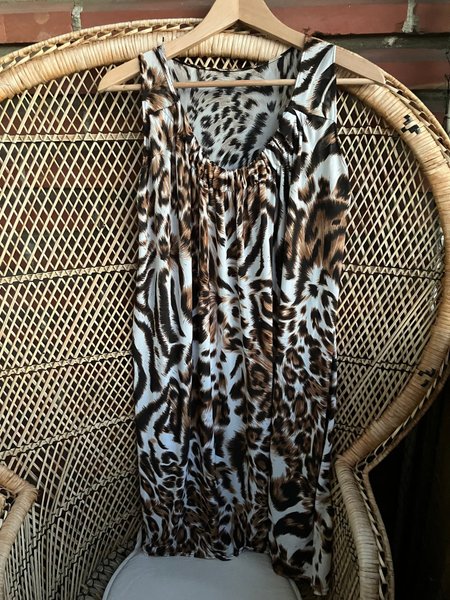 Ärmlös badklänning i snabbtorkande material, perfekt att dra på sig efter ett dopp i havet. Den är leopardmönstrad i nyanser av brunt, svart och vitt. Klänningen har en rynkad detalj vid halsen som ger en smickrande silhuett.