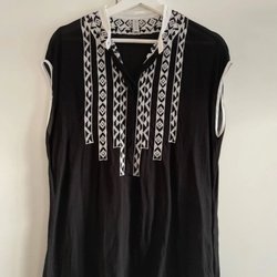 Beige klänning med huva och texten ”HEART MIND” tryckt på framsidan. Klänningen har korta ärmar, en ficka på magen och slitsar i sidorna.
