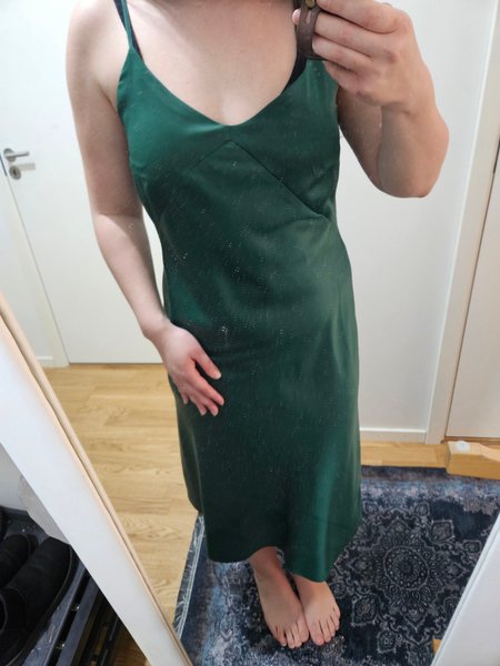 Grön klänning med smala axelband och v-ringning. Klänningen har en lös passform och når ungefär till mitten av vaden.