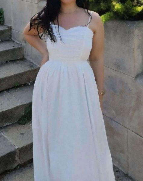 Vit klänning med smala axelband och en figurnära överdel. Klänningen har en markerad midja och en utsvängd kjol som når ner till anklarna.