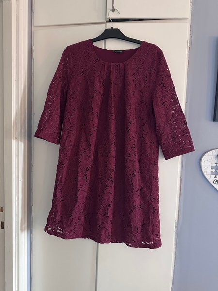 Vinröd klänning med trekvartsärm och spetsdetaljer.