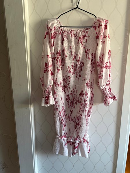 Klänning med långa ärmar och smockdetaljer över byst och midja. Ärmarna har en lätt puffeffekt vid axlarna och avslutas med smockmuddar. Klänningen har ett blommigt mönster i rött och rosa toner. Nederkanten är volangkantad.
