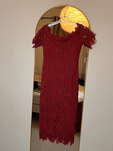 Vinröd klänning med spetsdetaljer och en off-shoulder design. Klänningen har korta ärmar och en figurnära passform som slutar strax under knät.