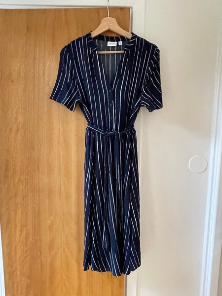 Klänning från Vila, stl 36, marinblå och beige. Mycket bra skick, använd ett fåtal gånger.