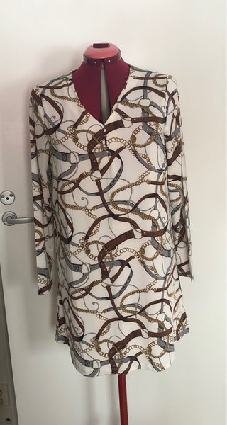 Klänning / tunika med långa ärmar och V-ringning. Mönstret består av bälten och kedjor i olika färger som brunt, guld och grått på en vit bakgrund.