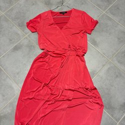 Klänning med V-ringning. Klänningen har en omlottdesign upptill och en markerad midja med draperingar som skapar en smickrande silhuett. Kjoldelen faller löst och har en bekväm passform.