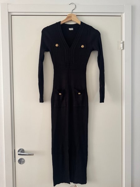 Svart ribbstickad klänning med långa ärmar och V-ringning. Klänningen har dekorativa guldfärgade knappar vid byst och fickor framtill. Modellen är figurnära och slutar vid vaden.