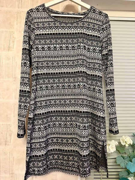 Svart och vit klänning med långa ärmar och ett geometriskt mönster. Klänningen har en rund halsringning och en avslappnad passform. Den har även en slits på sidan.