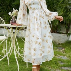 Vit, långärmad klänning med spetsliv och böljande kjol. Perfekt för speciella tillfällen.