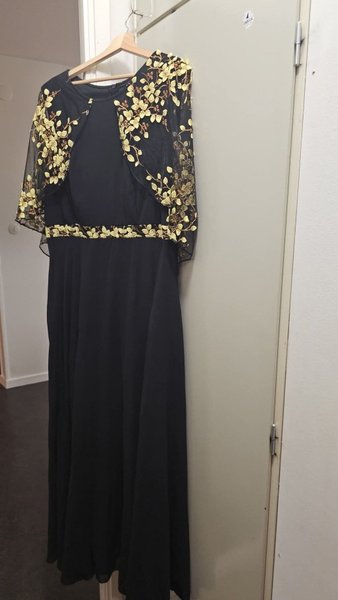 Elegant svart klänning med en bolero med broderade blommor i guld. Klänningen har en markerad midja med ett band av samma broderade blommor som boleron.