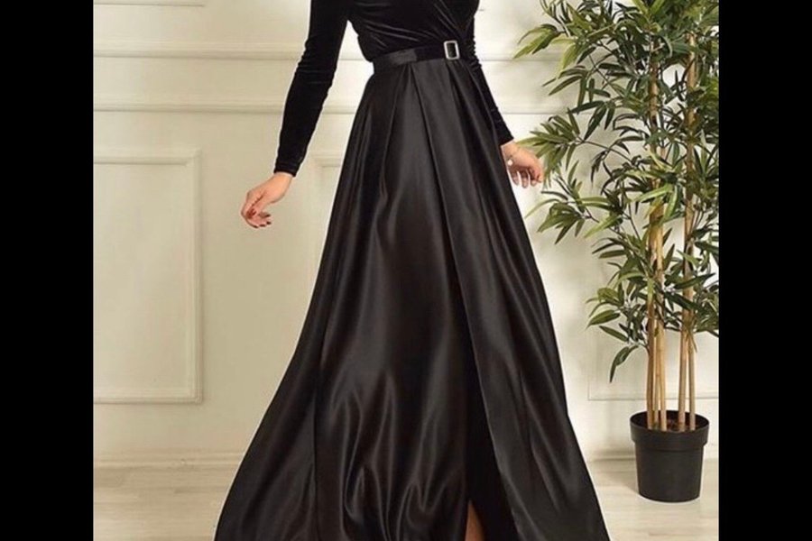 Elegant svart klänning med lång ärm och v-ringning. Klänningen har en markerad midja med ett dekorativt bälte och en lång, böljande kjol med en hög slits.